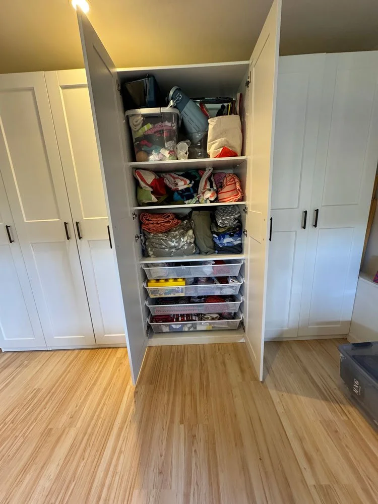 Our clients wanted to keep the decor simple, so we chose a beautiful synthetic (cleans up easily) area rug and a cozy sofa sleeper, a cool looking chair off Amazon and a coffee table. The TV fit perfectly (phew) and remarkably, all the gear found its allotted location.Even before we finished, the kids were having sleepovers, tutoring sessions had found a home with no distractions, parents had a daytime place to work and best of all, wetsuits and ski gear, fishing tackle and bike helmets were so accessible that they could decide on the sport de jour and get out the door in ten minutes.