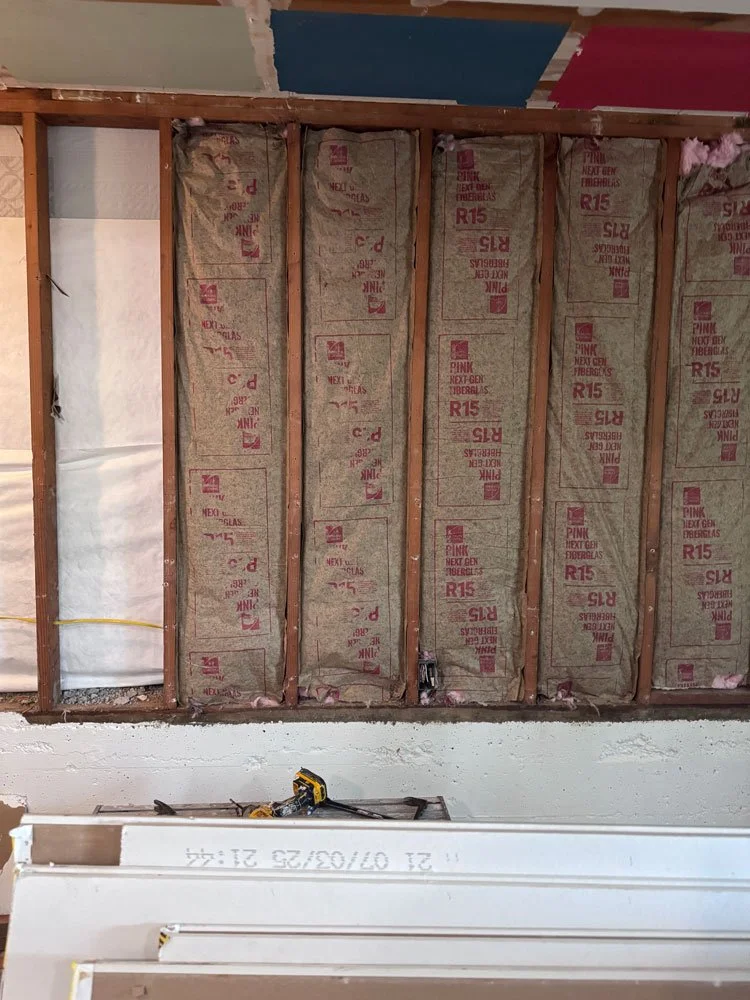 The demolition and first phase of rebuilding took place during a two-week period while the family was on vacation. My crews came in swinging – and we removed all existing cabinets (tiny, broken, useless), taking much of the structure down to the studs. Insulation was next – who wants to hang out in a freezing garage? The floor – broken concrete – was a problem, so we built a new one over it. The lighting was…very garage, so we brought in our electrician and improved it. We painted. We built a laundry closet and re-oriented the washer/dryer, so that it was in its own zone, while chanting our mantra…. “Make it feel like a real room…” We added a six-foot wide glass slider, banishing the grim garage feel. But…whoops – that slider needed a deck for an exit. Summon the carpenters.