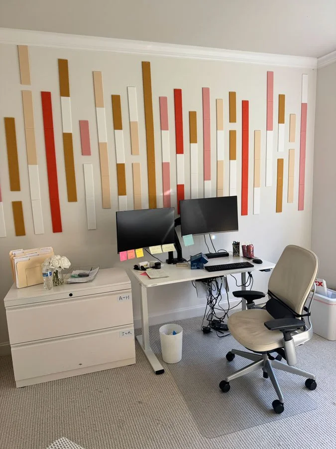 From the start, Cathryn approached the project with smart planning and a family-first lens. She helped us make the spaces functional and beautiful: setting up a garage playroom that actually works for real life, creating a mudroom system with hooks so the kids’ jackets, shoes, and backpacks have a home, and designing my office so it feels intentional instead of improvised. One of my favorite details is the unique sound-muffling wall design she created behind my computer monitors—it’s both practical and visually interesting—and her team handled installation so it was truly turnkey.