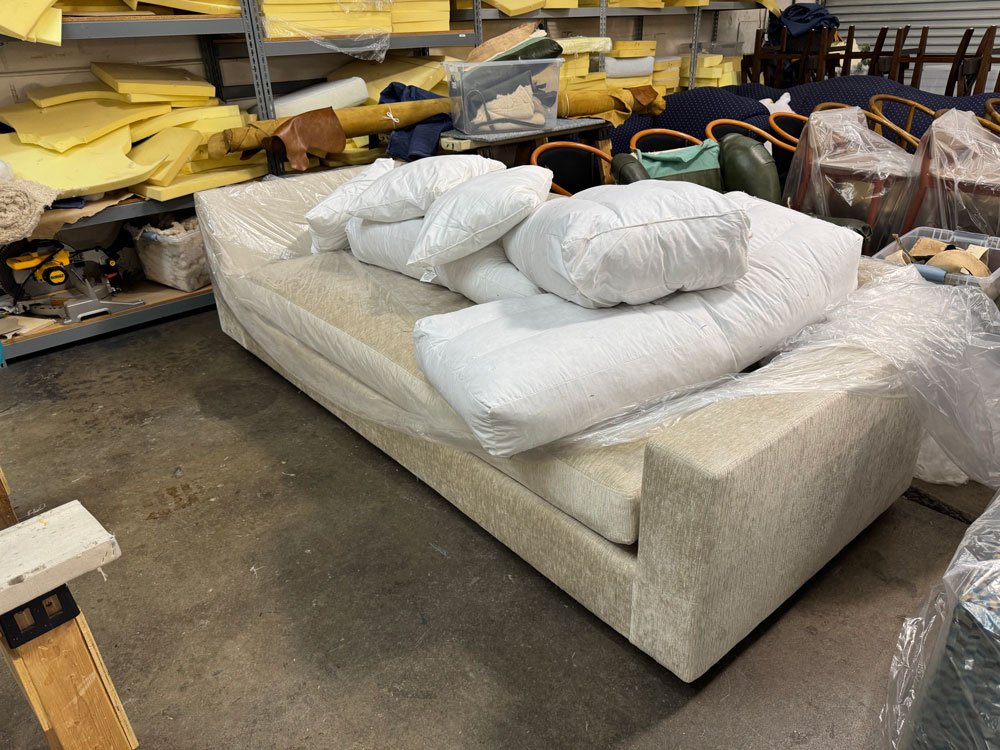 Much of the furniture dated from the couple’s first apartment – and the kids and dog had been pretty tough on it. We discussed replacing their beloved giant sectional– but beneath its stained and faded upholstery, this was a first-class piece of furniture, solid wood interior frame, goose down cushions. A similar model, new, would have cost $20,000 – totally unaffordable, so we decided to refurbish this beloved behemoth, for a quarter the price.