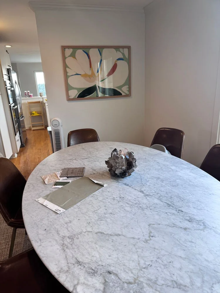 The main floor space, comprised of two long, narrow rooms -- a family room/dining room and a living room/work area meant that no standard rug would fit. We chose a warm and tweedy tan FLOR, also indestructible. A wall unit from Ikea, with designer-chic wooden doors (nothing “budget) made a new home for the TV – and provided storage for toys and books. We selected a painting – a soft, abstract landscape that the clients fell for immediately – and then a dusky gray green color for a long wall. A two-part puzzle coffee table was an easy-to-move piece for morning coffee, a bigger surface for games. The existing dining table – a long oval Saarinen look-alike, on a pedestal – finally looked like it belonged. A new credenza, lamp and another bright art piece kicked that dining area into high entertaining mode. The work area got new “aren’t we cool to WFH” swivel chairs and new bar stools and suddenly, dowdy turned dynamic.