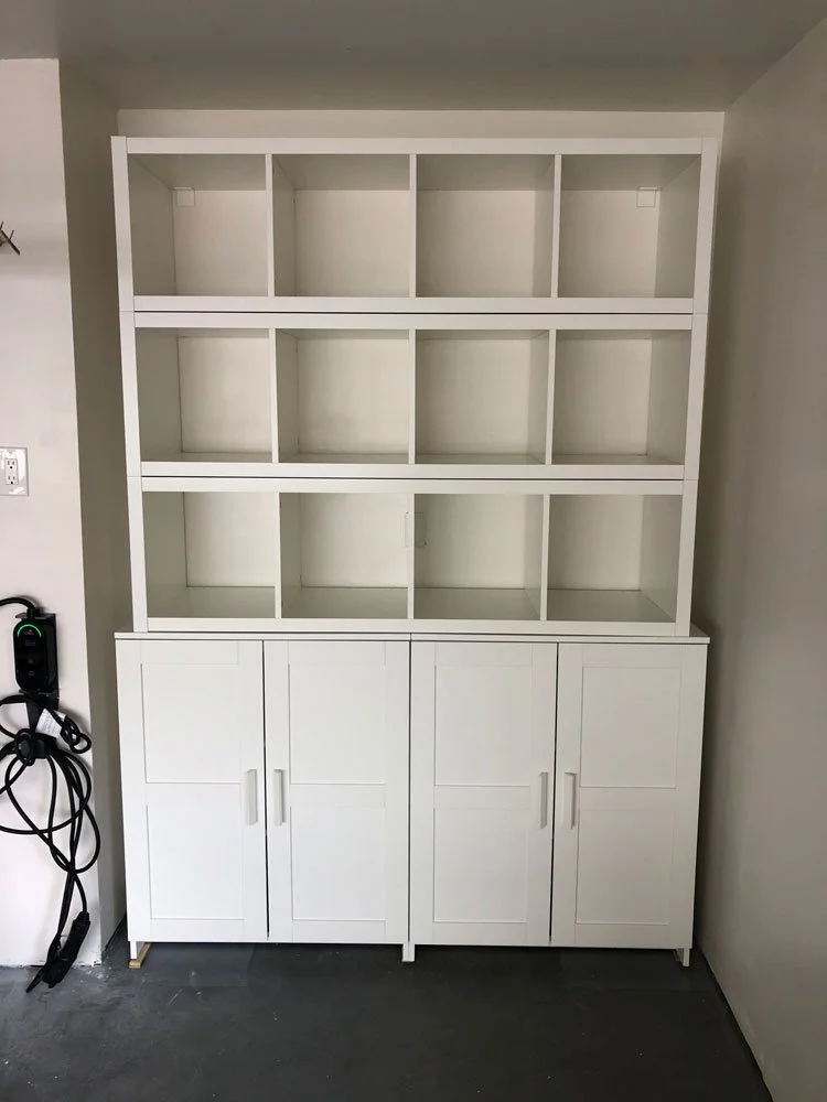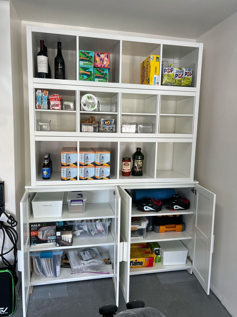 We planned all the storage – mostly from Ikea, assembled by our crack assembly team of Mark and Leigh (who was quite pregnant at the time), with carefully delineated requirements in mind. Mikado Parenthood advised on how to expedite toy storage and rotation, and every single item found a place – even the baby gear that just might get used one more time. Hefty overhead shelves in the garage took care of items that were rarely used, like holiday decorations. No more scrabbling through broken cabinets, looking for the Easter baskets that are in there, somewhere.